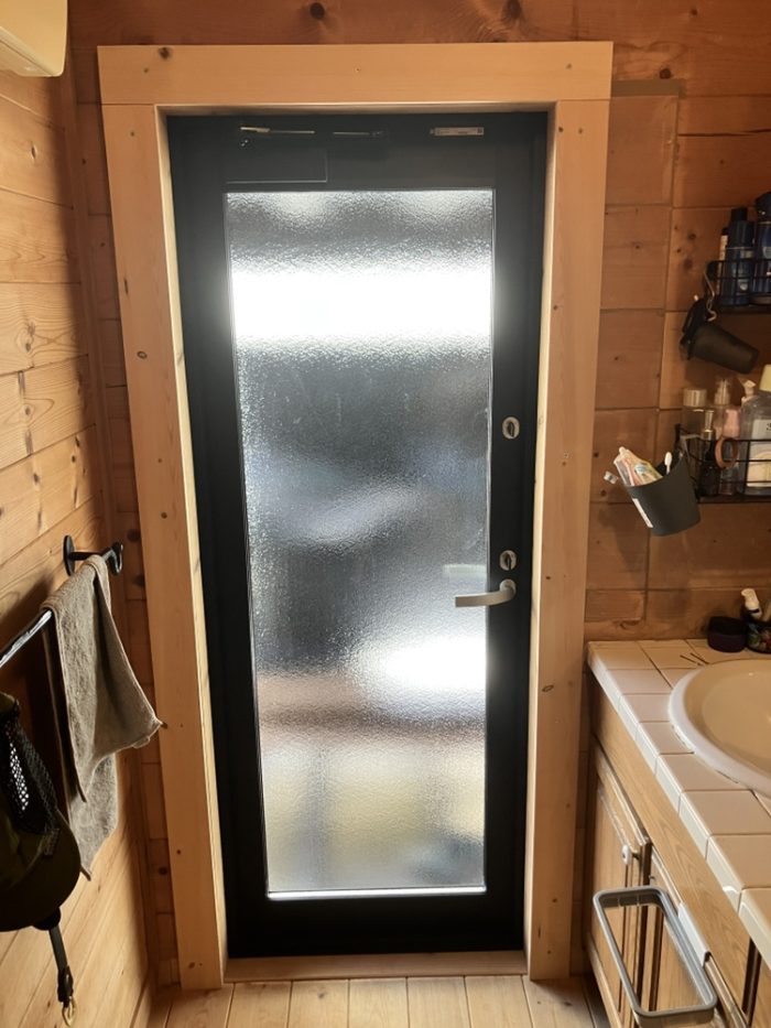 外部からできる限り様々な寸法を測定し、見えない部分の納まりを予測し、その予測から新しいドアの寸法を割り出し設置したのがコチラ!