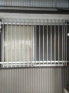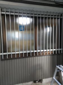 昔ながらの格子付きシルバーのサッシ。